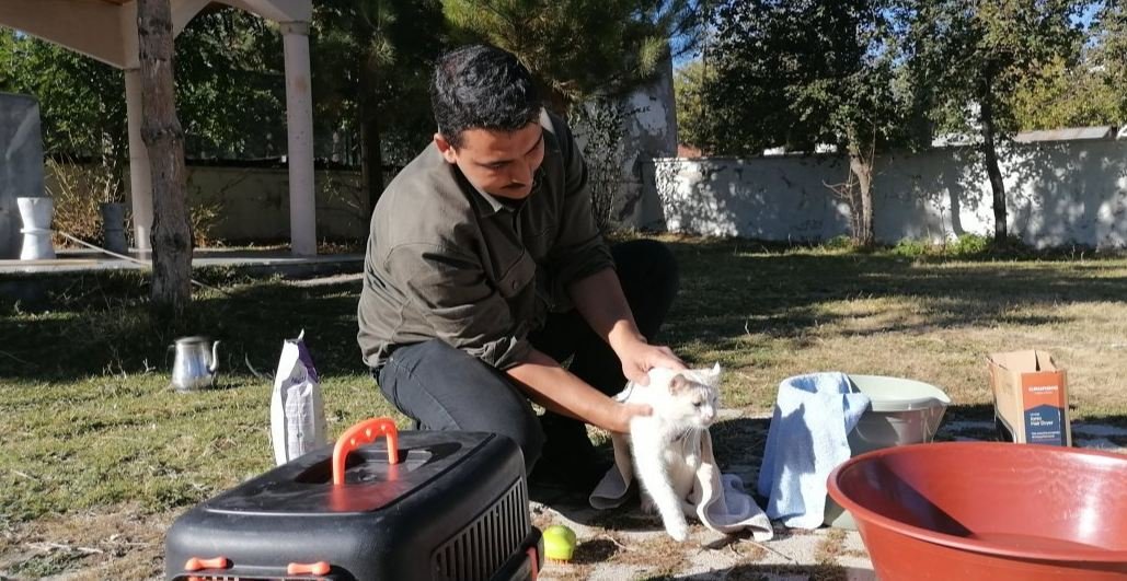 Юнус Чайкара купает котика во дворе мечети, фото Anadolu