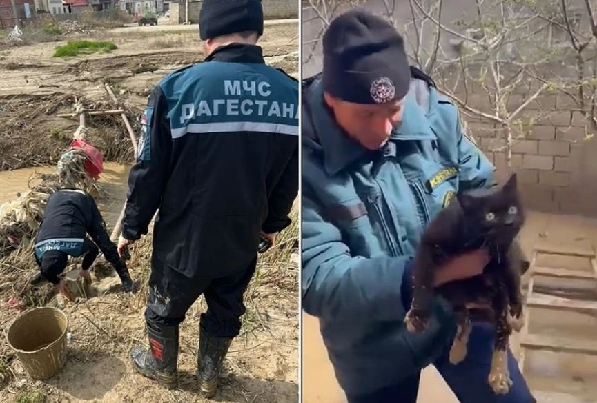 Во время наводнения люди спасали друг друга и животных, попавших в беду. На этот раз отличились спасатели, которые во время расчистки домовладения в Махачкале наткнулись в глубокой грязевой яме на кошку, да не одну. Животное явно там находилось не первый день и было обречено.